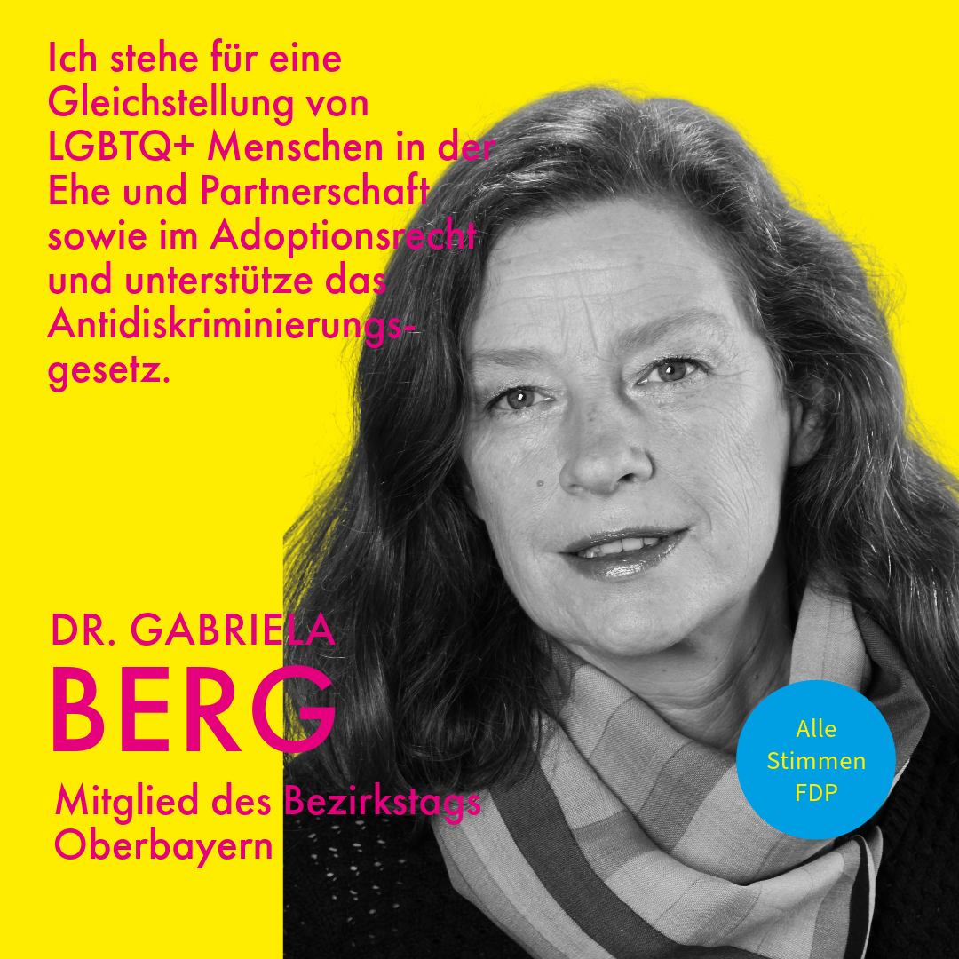 Queerpolitisches Statement von Dr. Gabriela Berg, Mitglied im Bezirkstag Oberbayern. Für liberale queere Politik im Bayerischen Landtag und den Bezirkstagen am 8. Oktober 2023 beide Stimmen FDP!