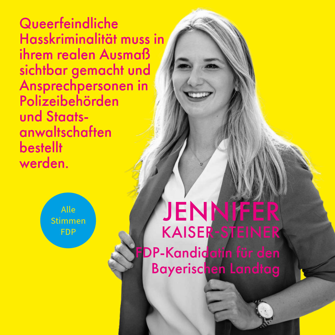 Queerpolitisches Statement von Jennifer Kaiser-Steiner, FDP-Kandidatin für den Bayerischen Landtag und Mitglied von LiSL Bayern. Für liberale queere Politik im Bayerischen Landtag und den Bezirkstagen am 8. Oktober 2023 beide Stimmen FDP!